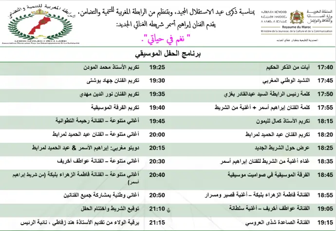 يسرّ الرابطة المغربية للتنمية والتضامن بتطوان، وبتنسيق مع قطاع الشباب، أن تدعوكم لحضور أمسية فنية متميّزة تجمع نخبة من الفنانين والفنانات، احتفاءً بإصدار الشريط الغنائي الجديد للفنان إبراهيم أسمر بعنوان "نغم في حياتي"، وتخليدًا لذكرى عيد الاستقلال المجيد.